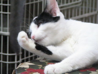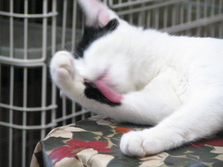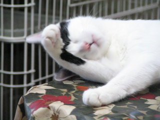 シロミミはおおあくび。これは顔を洗っている途中ですが。