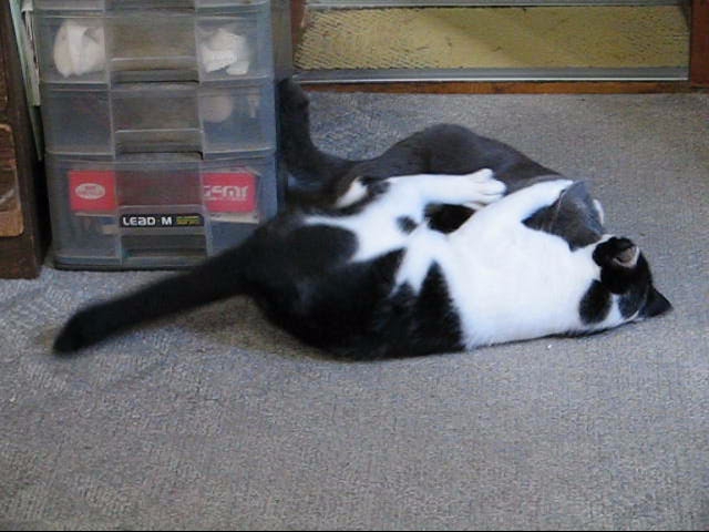横に寝転がってしっぽをゆっくり動かすのが「よし!かかってこい!」