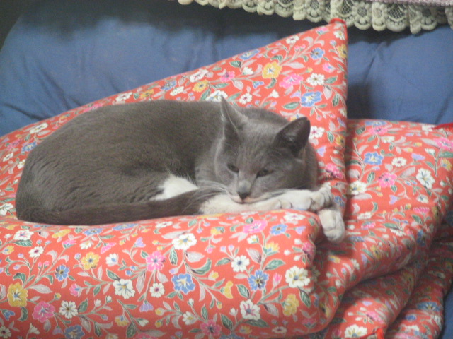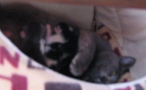 でも、おかげで?ぎんは、子猫たちをマルに預けて、床でのんびりしたり出来るようで・・・ (ぎんがいない間は、マルが抱え込んで暖めたり、なめてやったりしています)