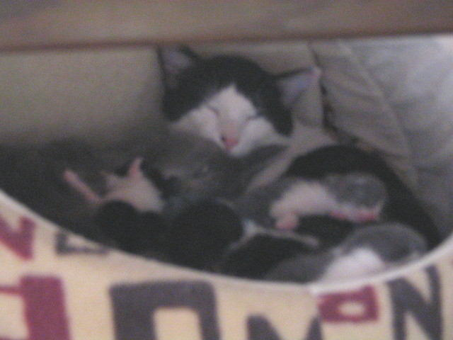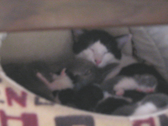 ぎん&赤ん坊猫6匹&マル・・・ が、狭いところに詰め込まれています。うーむ。「狭いながらも楽しい我が家」って!?(笑)