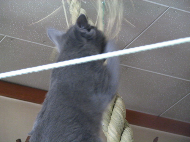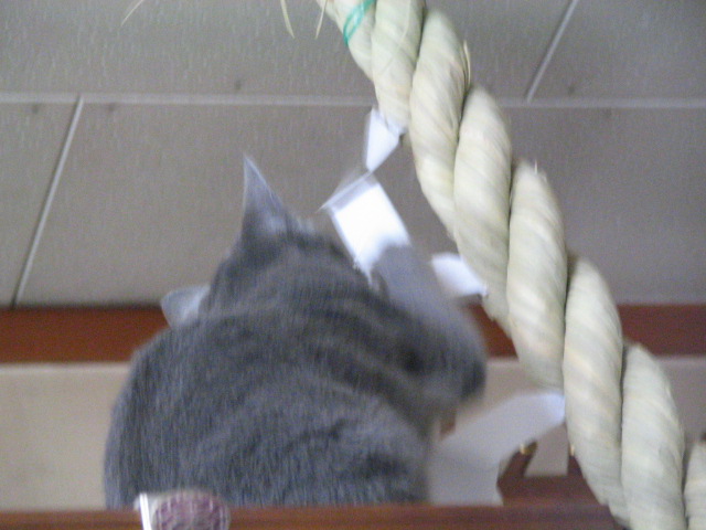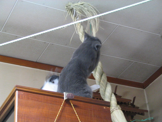 いや、食器棚上に近い、ごぼうじめの細いほうの端にじゃれかかってるなぁ、とは思っていたんですけれどね。(苦笑)
