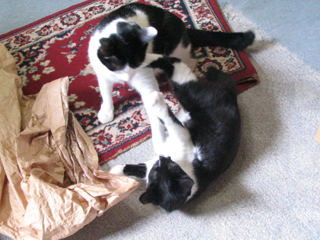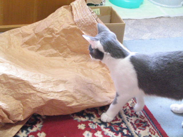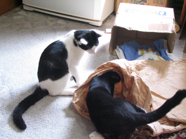 ちなみにこの包装紙で一番遊んでるのは、たぶん仔猫じゃなくて親猫のマルとぎんです。(^^;; あの子らも、まだまだ「こども」なんですよねー(苦笑/1歳ちょっとぐらいだし)
