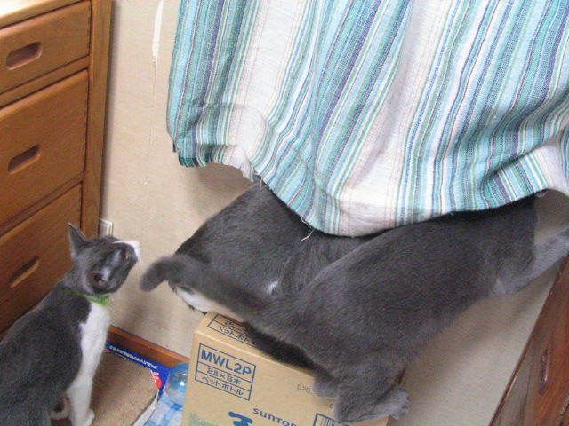 カーテンの向こう(の窓の外)に興味津々のグレイ系きょうだい達。