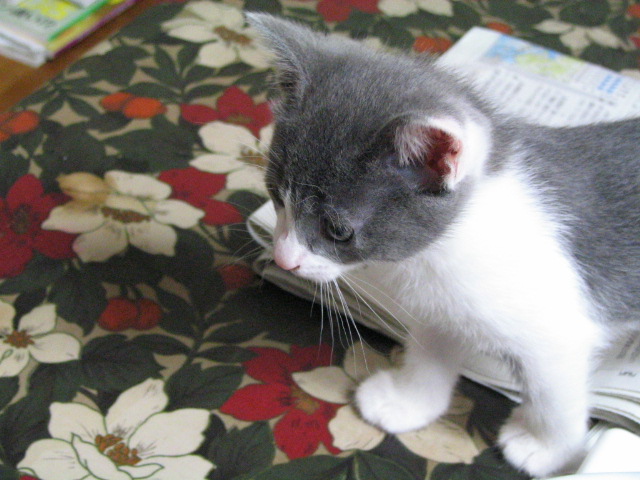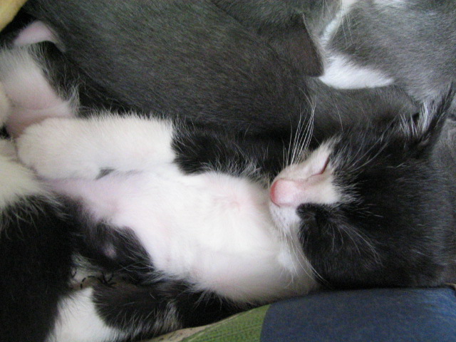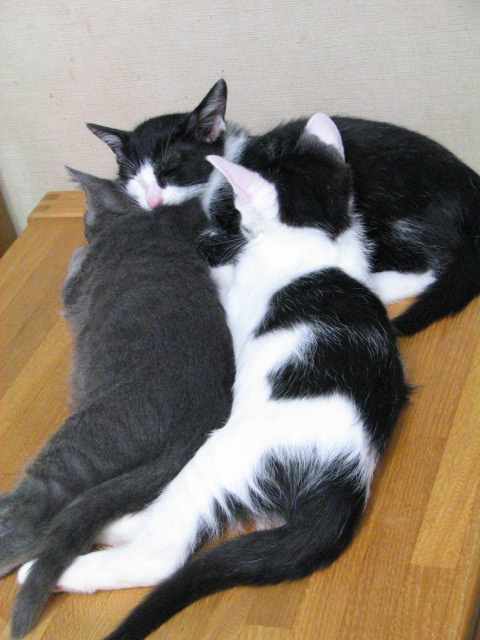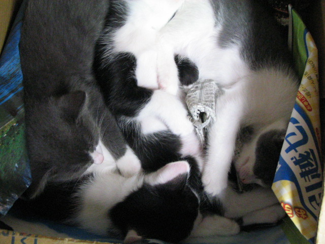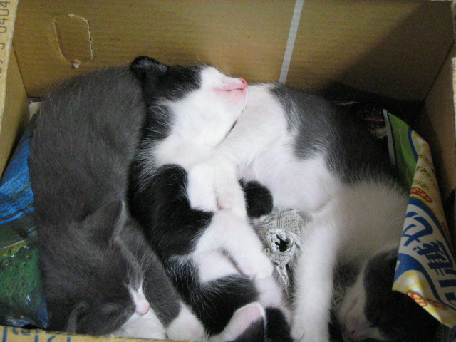 おそらく唯一の男の子は、見た目よりずっしり重いのです。触ってみると、なんとなく(仔猫にしては)固いしね。これが「男の子」ってこと、なのかなぁ。