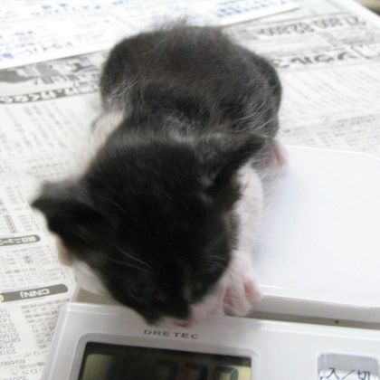 本日24日のマメクロ。こっちに向かって来ちゃってます。(^^;; 体重は371グラムと、ぐっと増えました。(おっぱい飲んだ直後ということもあります)
